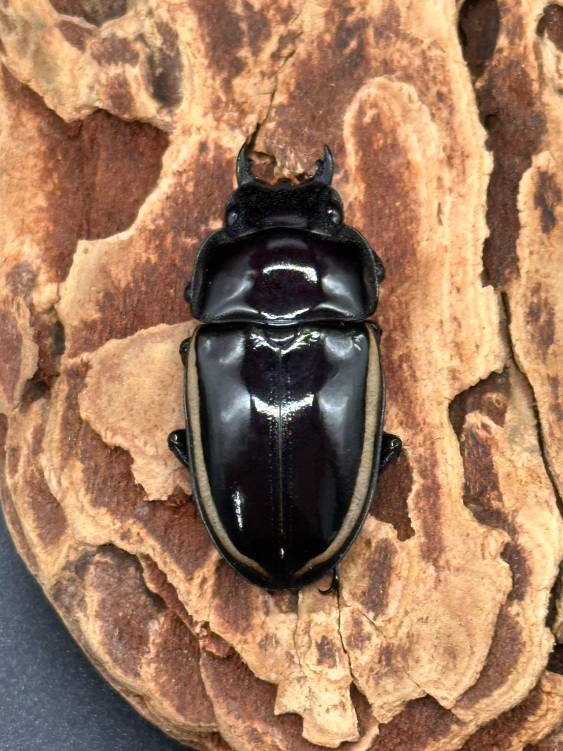 体が太く前に伸びた大顎に上翅のエッジにクリーム色がのるのが特徴です。