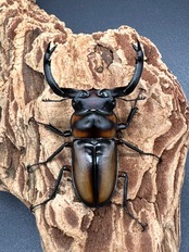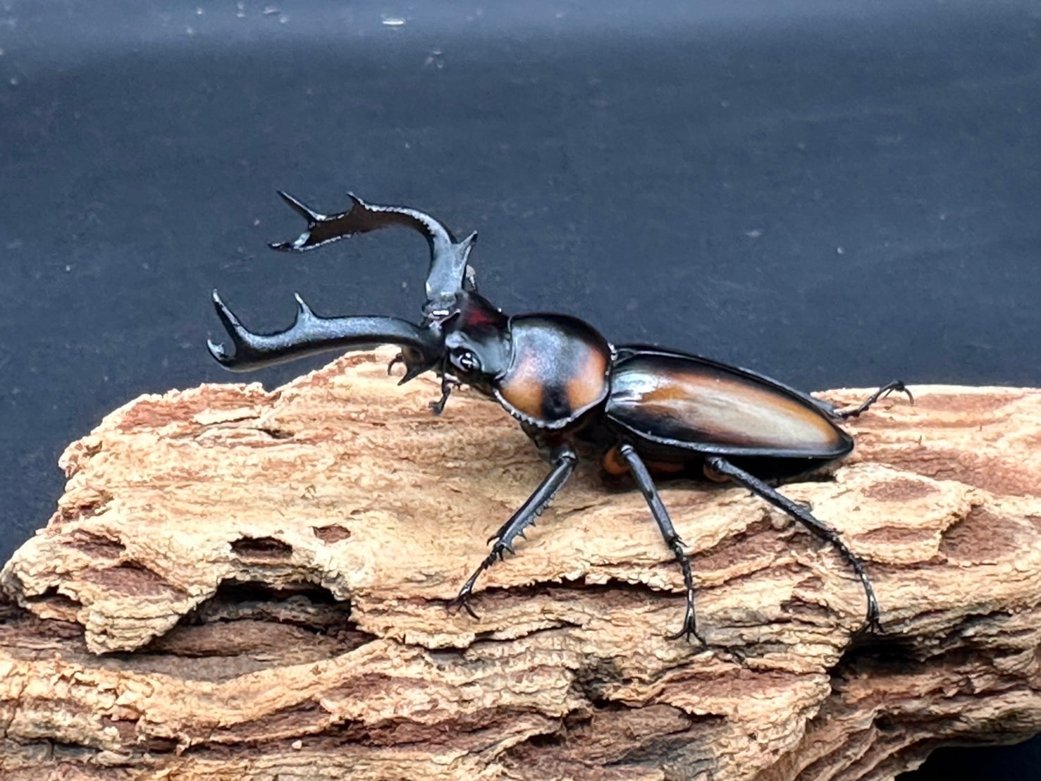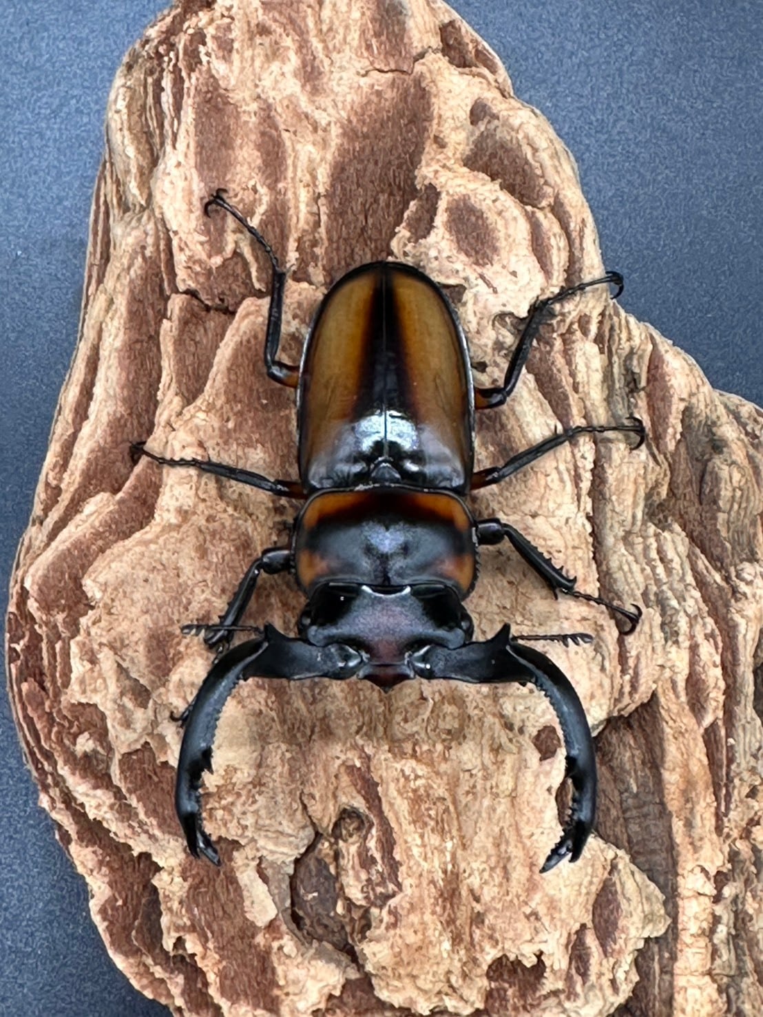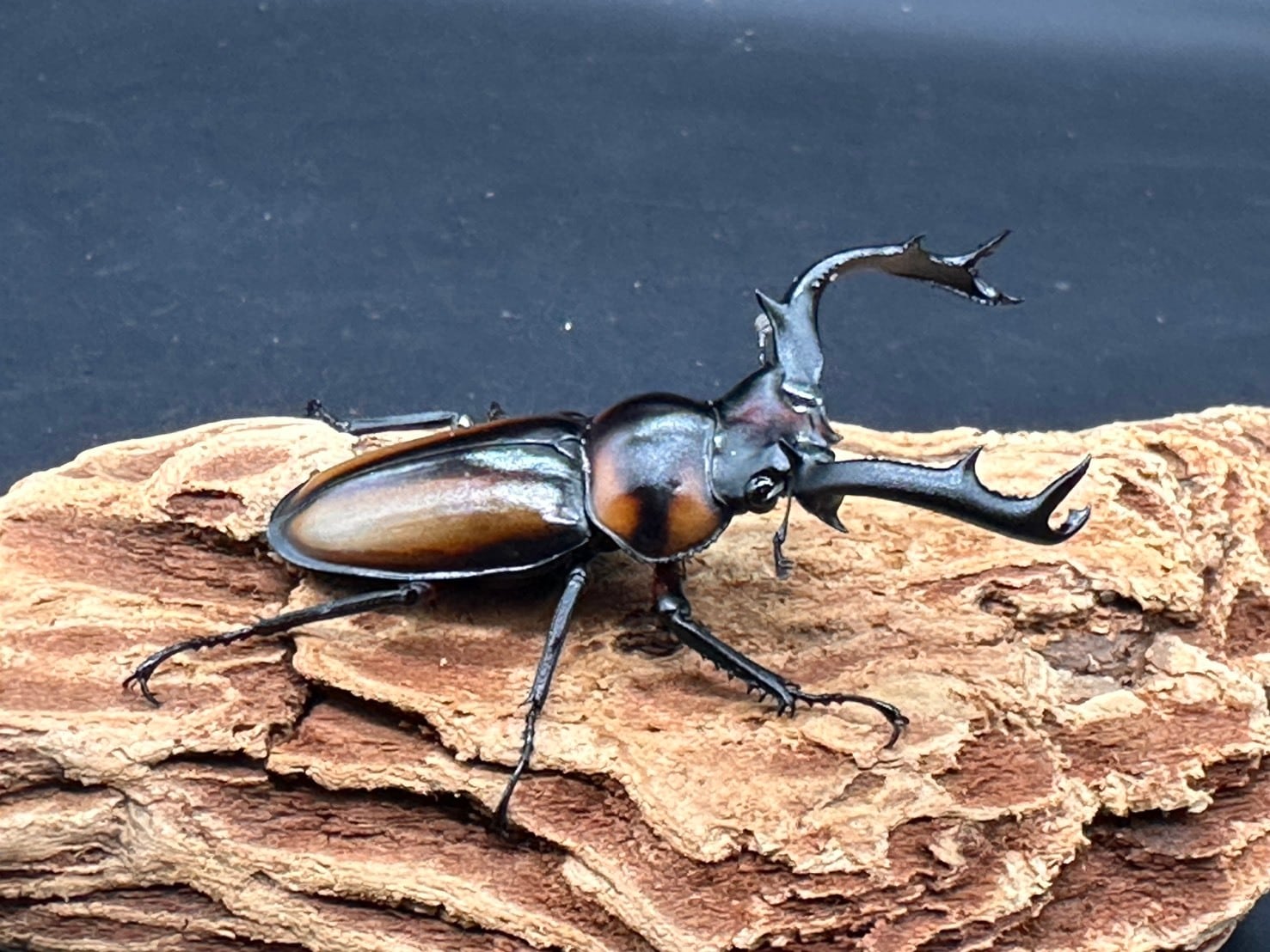 シカクワガタの代表種で美しい紋様と横に大きく広がり、横から見ると鹿の角のような形に見える大顎が特徴です。