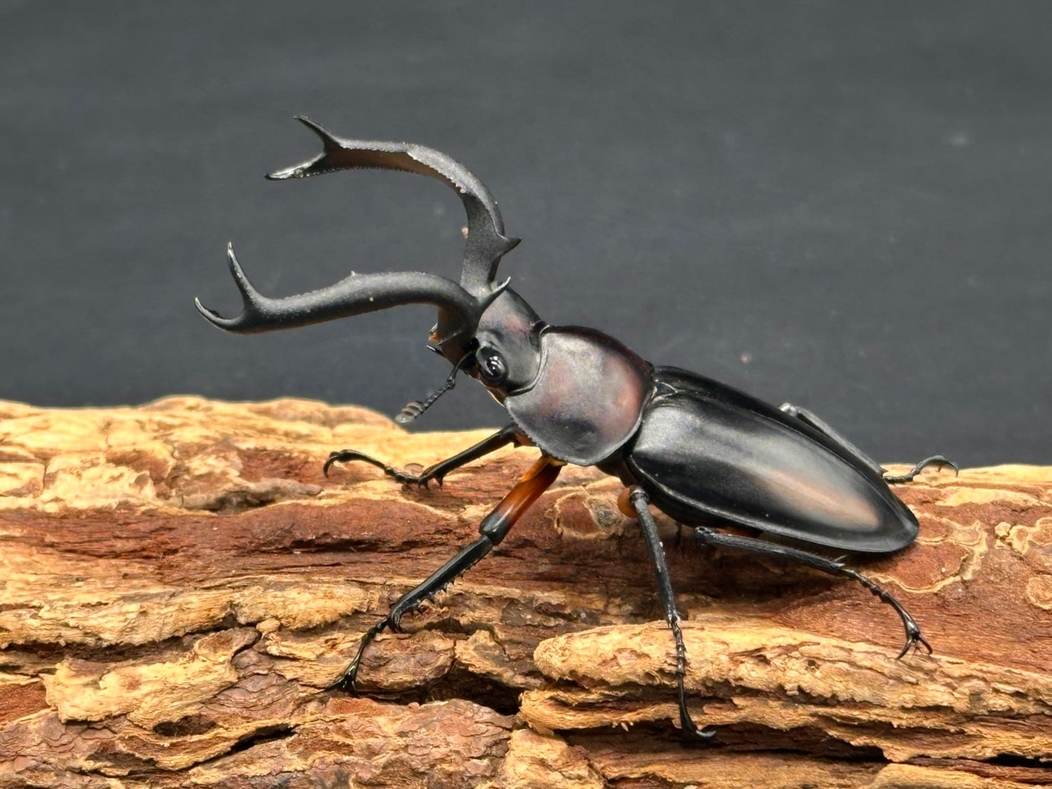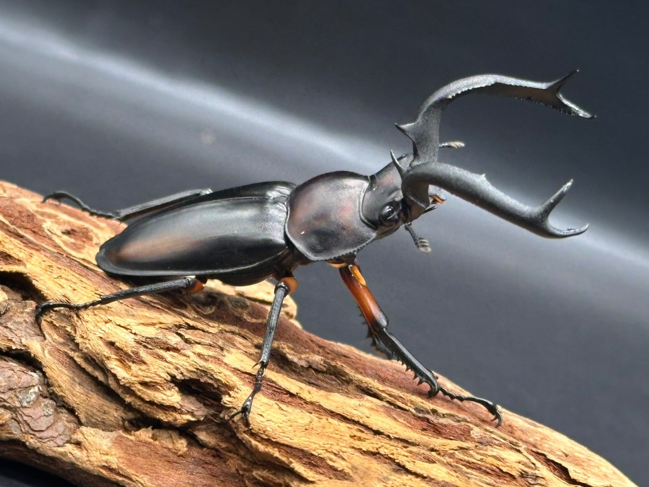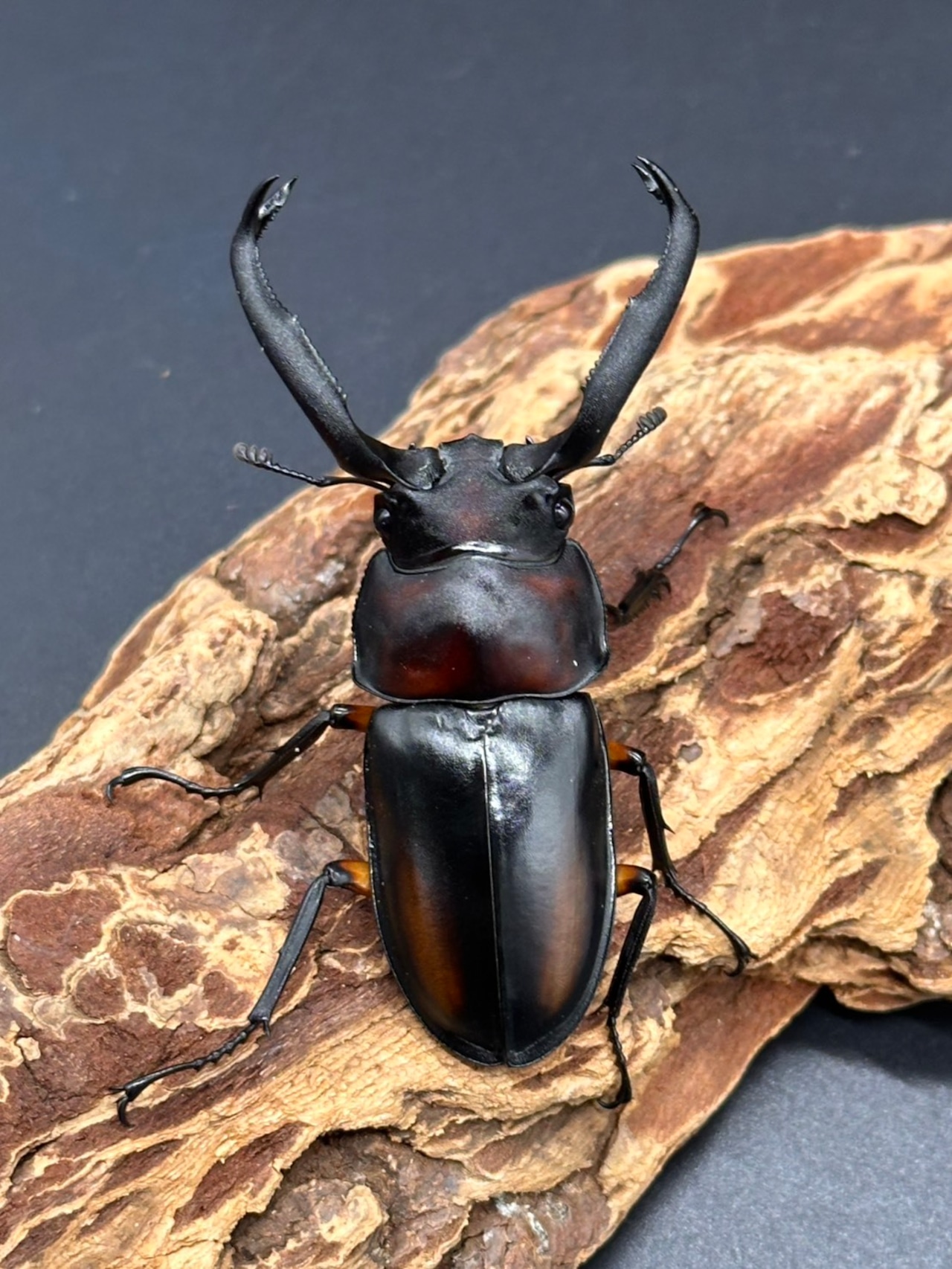 立体的に大きく広がる大アゴに、上翅に赤やオレンジの紋様が入り、かっこよさと美しさを兼ね揃えた人気なシカクワガタです。