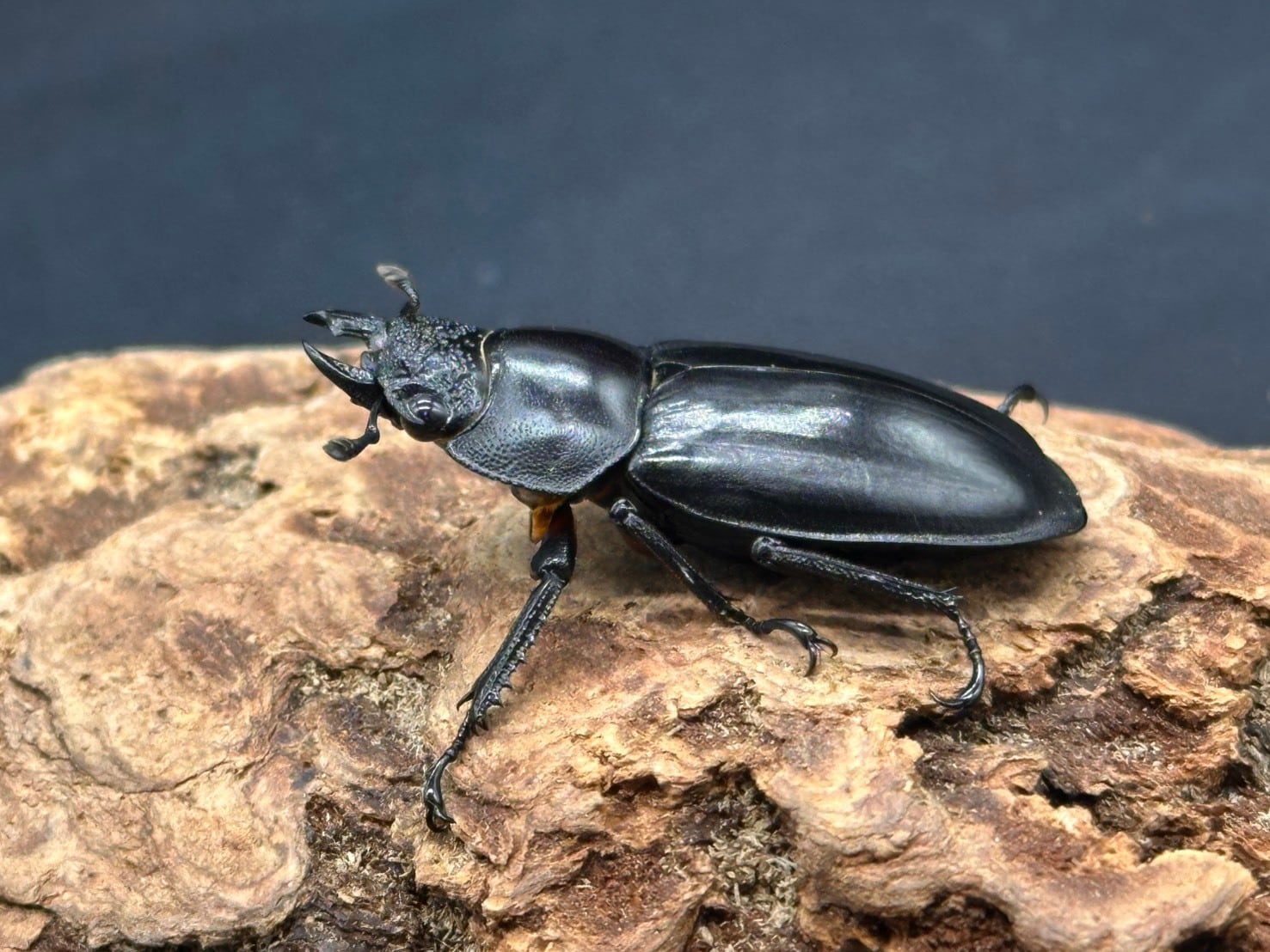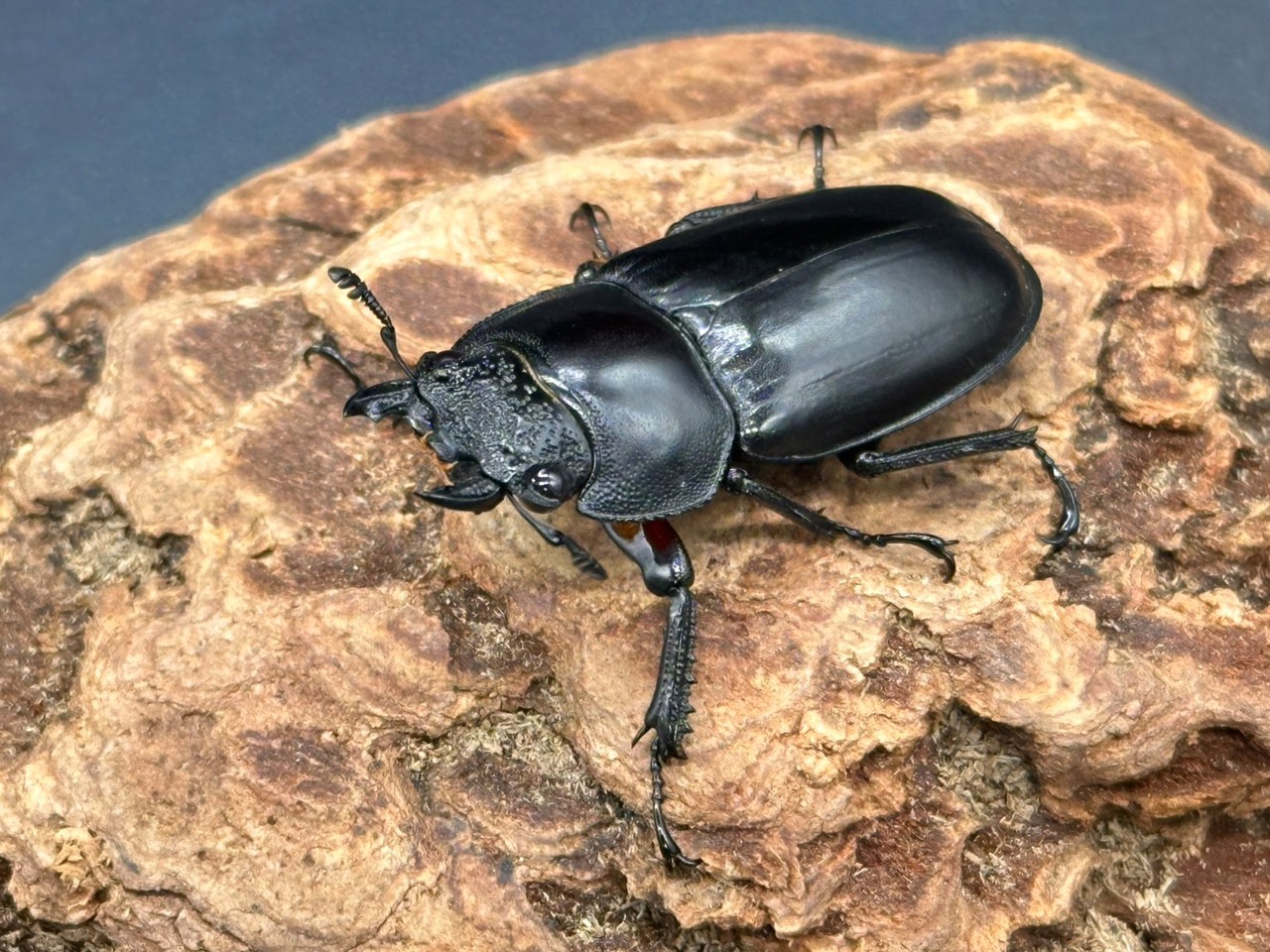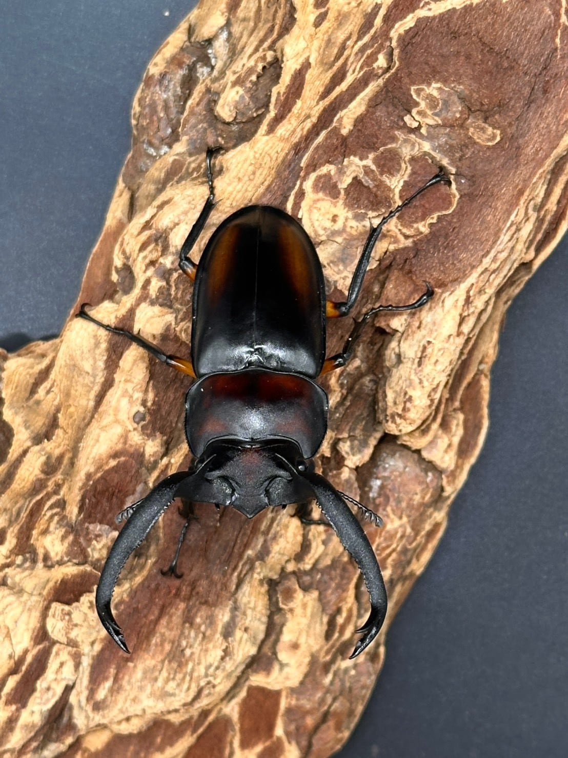 立体的に大きく広がる大アゴに、上翅に赤やオレンジの紋様が入り、かっこよさと美しさを兼ね揃えた人気なシカクワガタです。
