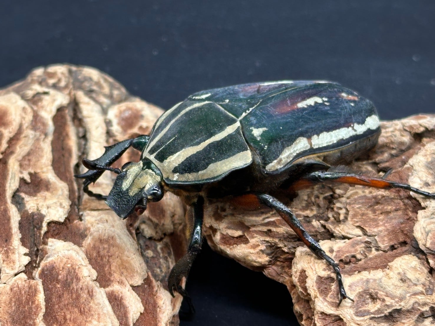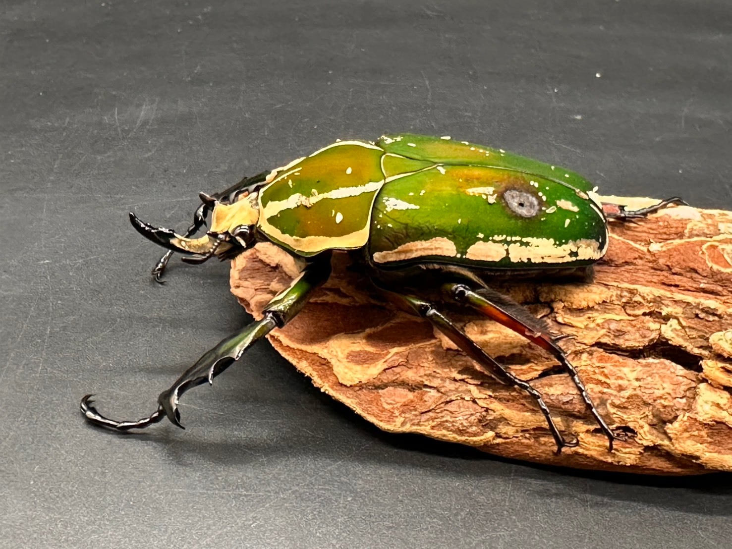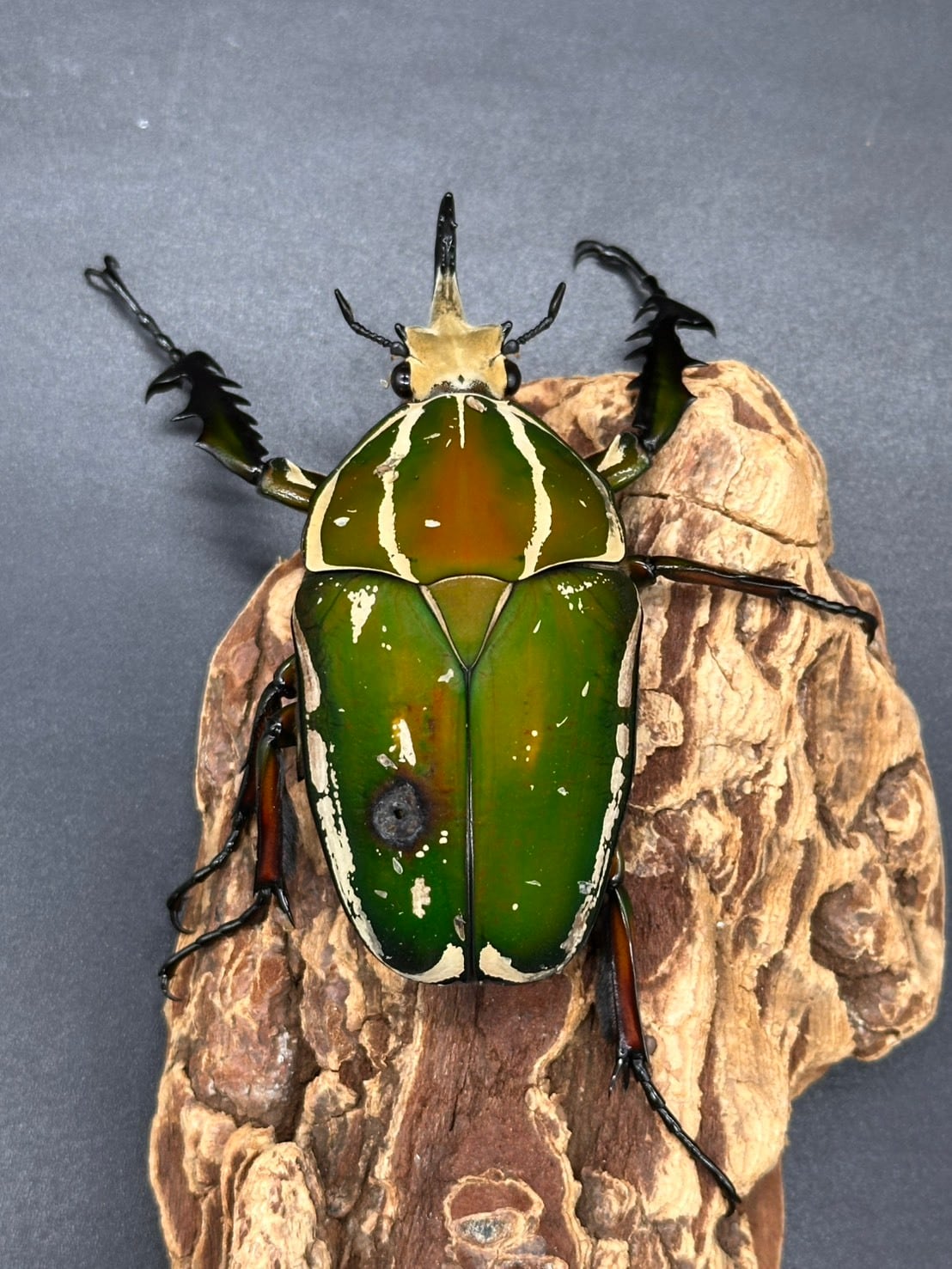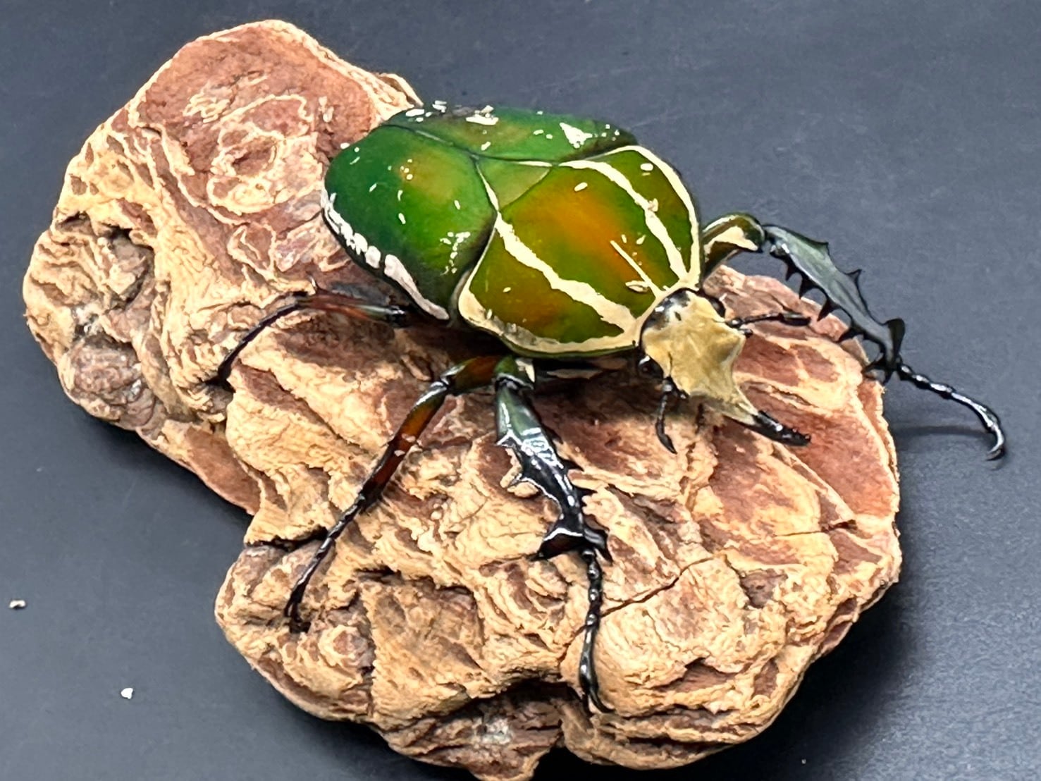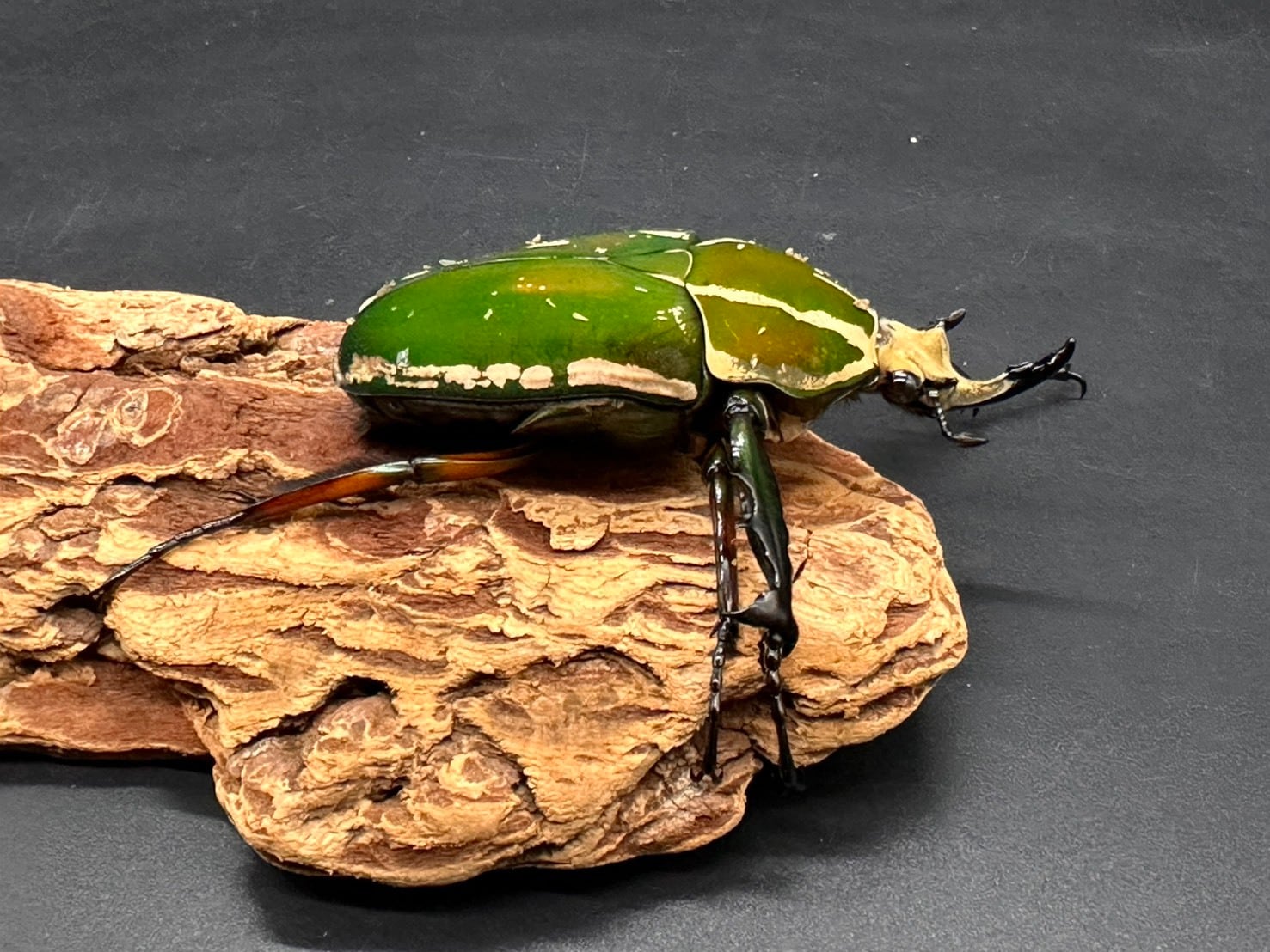 鋭く伸びた頭角、刺々しい前足、ビロード状の毛が美しく生え揃ったかっこよさと美しさを併せ持つ魅力的なカナブンです。