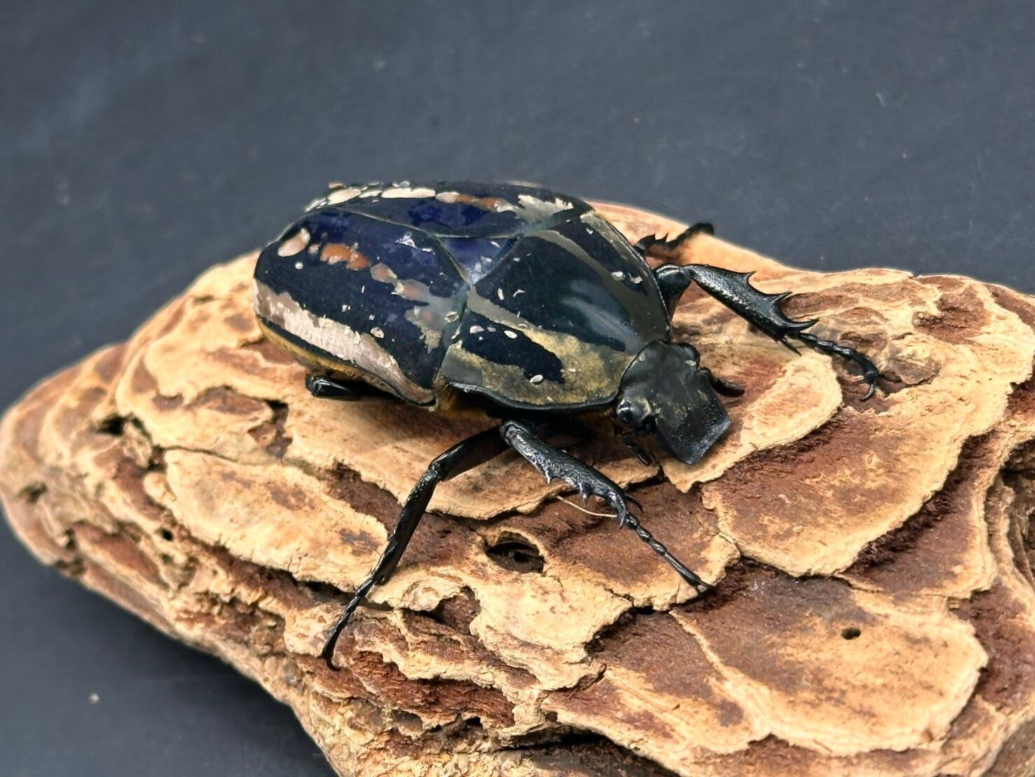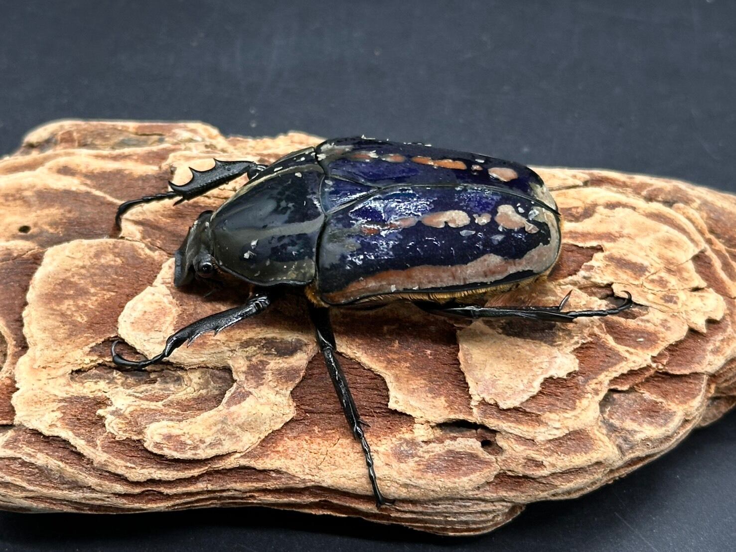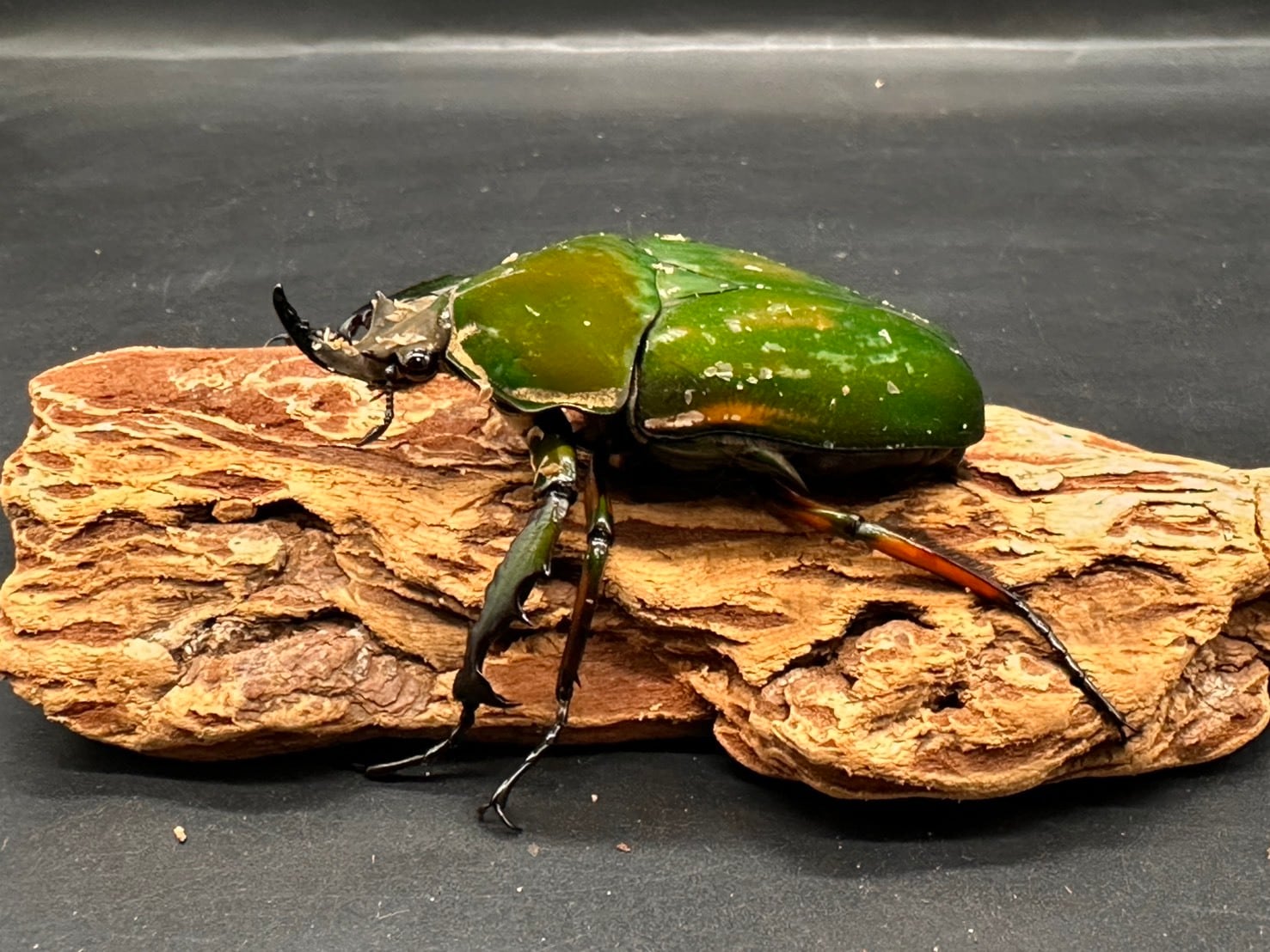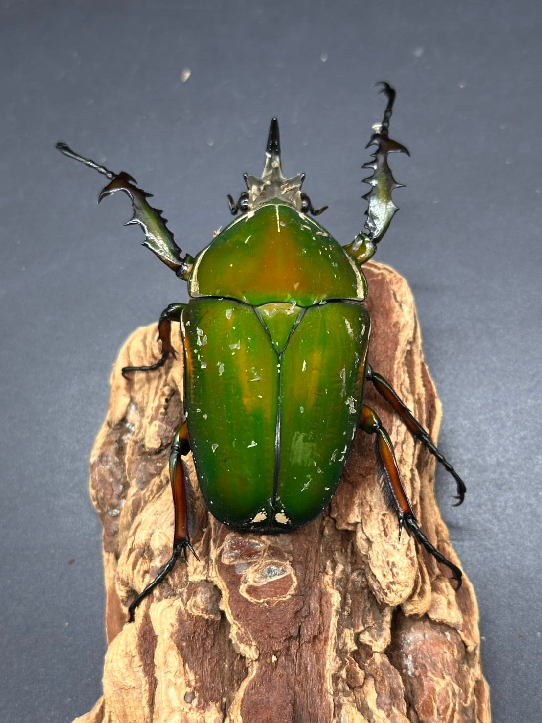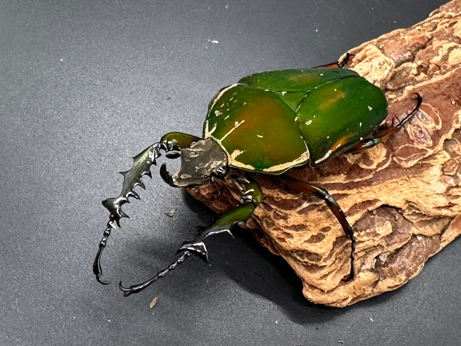 鋭く伸びた頭角、刺々しい前足、ビロード状の毛が美しく生え揃ったかっこよさと美しさを併せ持つ魅力的なカナブンです。