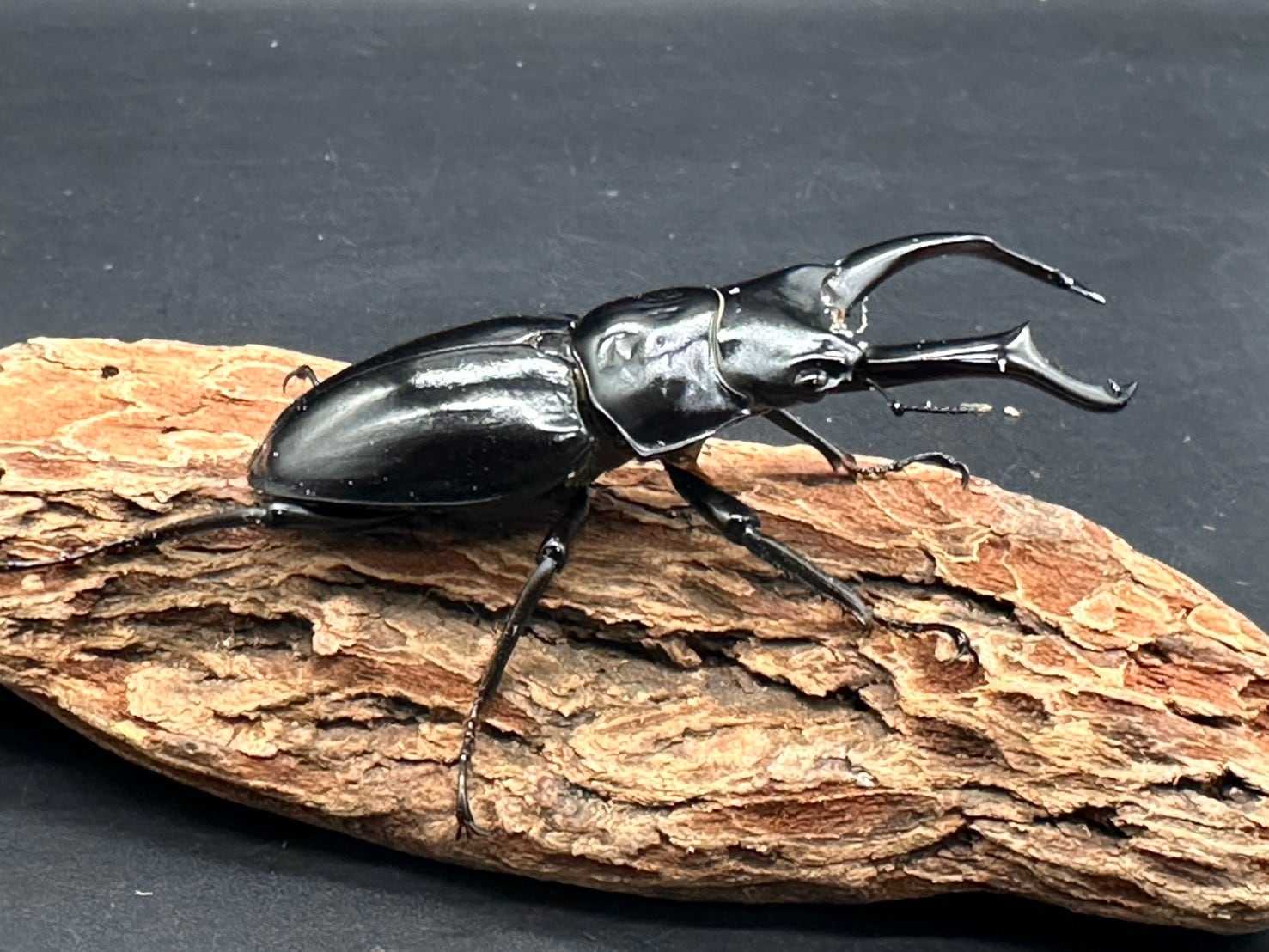 黒く艶のある体と長く大きく発達した大顎がかっこいいクワガタです。