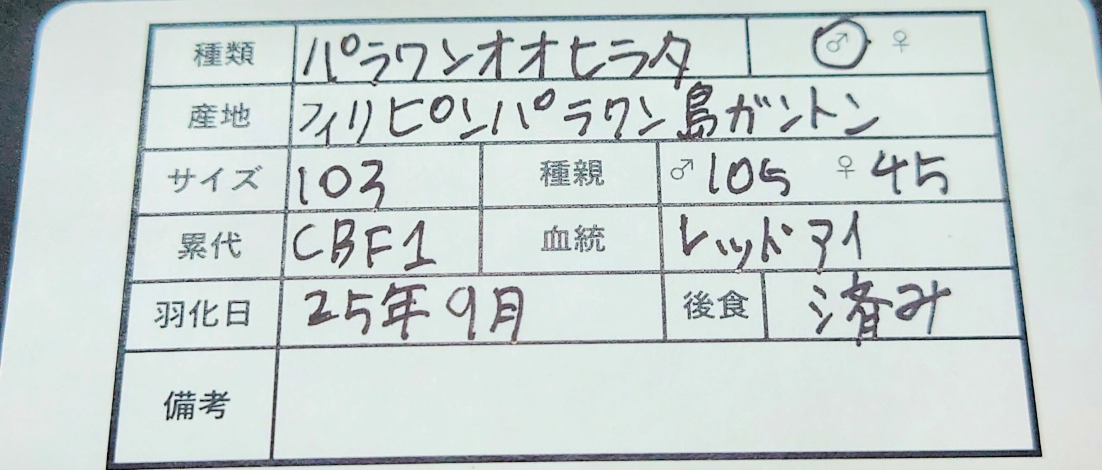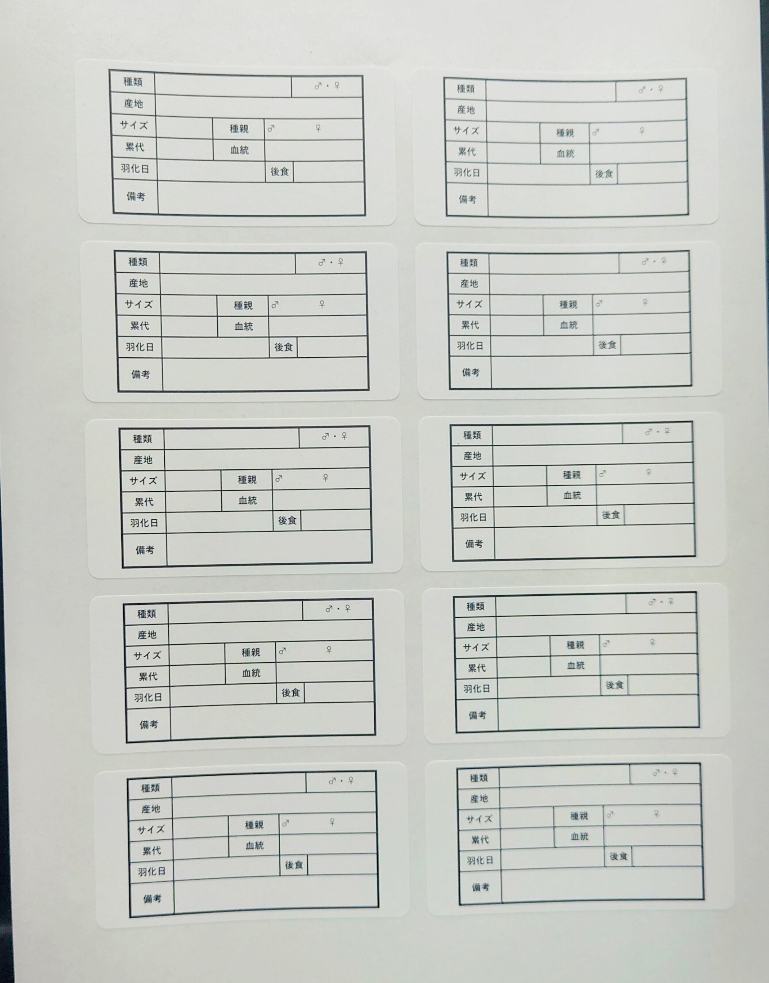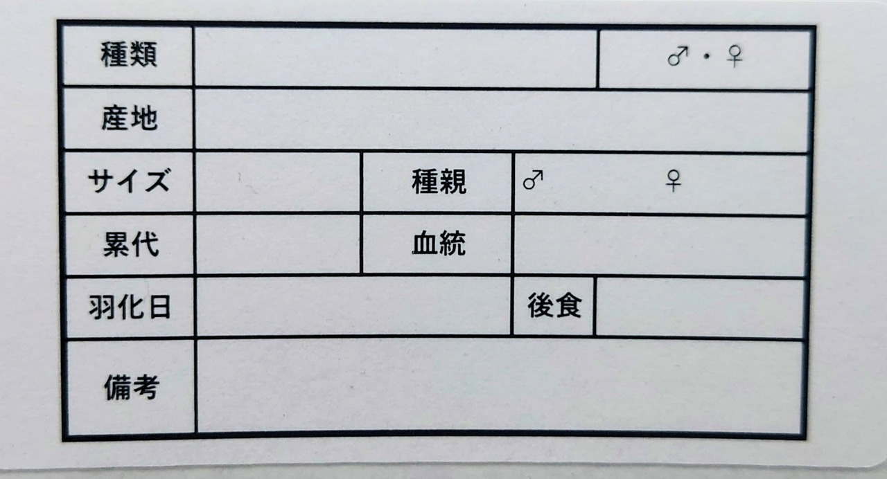 種類・産地・サイズ・種親・累代・羽化日・後食と管理するうえで必要なことがすべて1枚で書けます!