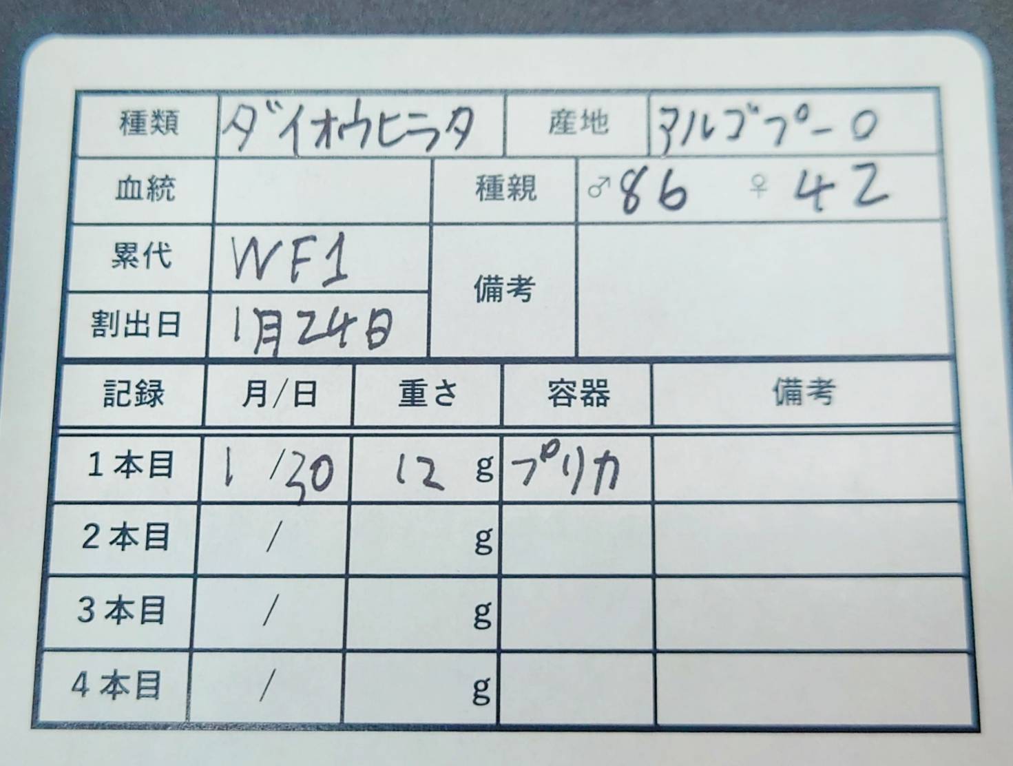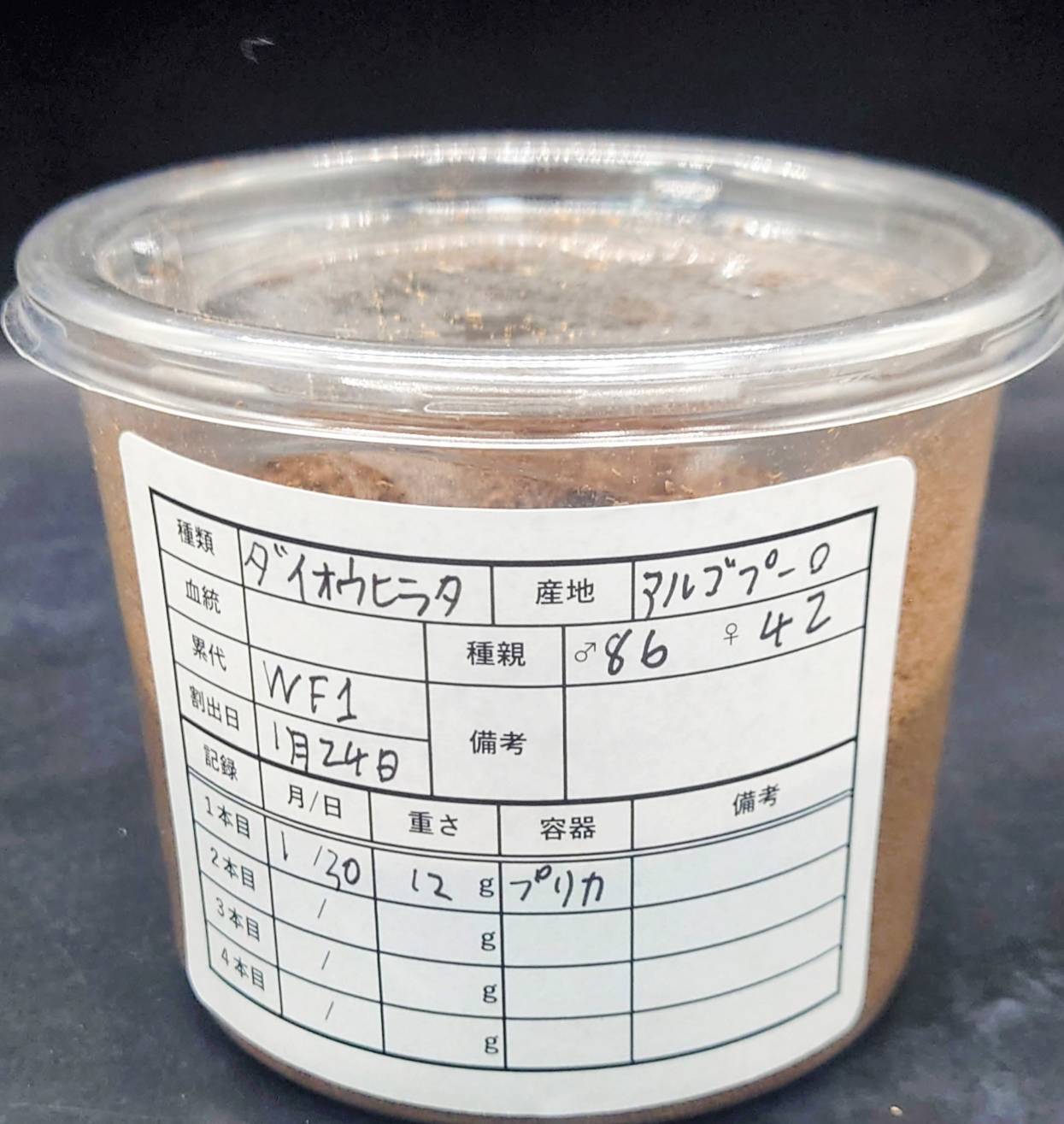 ・累代表記がWDの生体は天然採集個体のため羽化日がわかりませんので、産卵セットを組まれる方は出来るだけ早く組むことをお勧めいたします。(天然採集個体のため傷、ダニの付着がある場合がございます。)