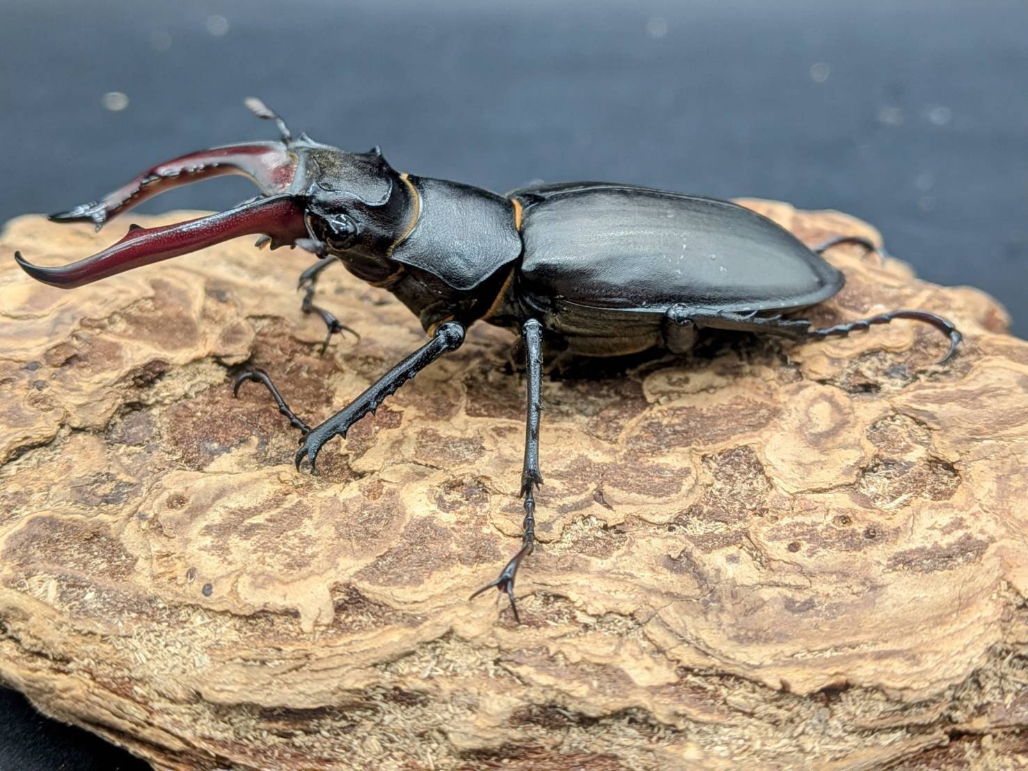 日本のミヤマクワガタと違い体毛がなく、顎の先端が大きなフタマタ状になりとても迫力があります。